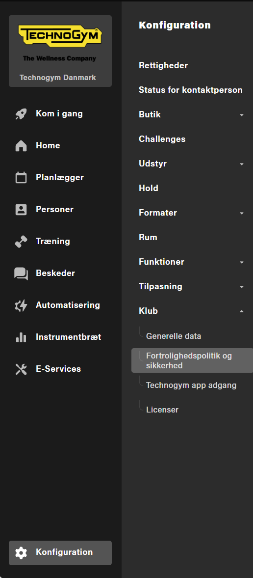 2. Gå til Konfiguration > Klub > Fortrolighedspolitik og sikkerhed.