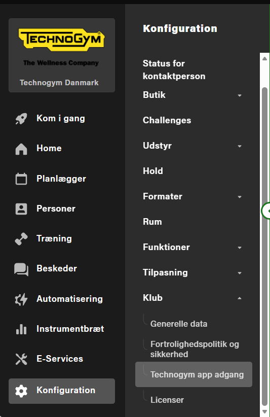Konfiguration > Klub > Technogym App Adgang